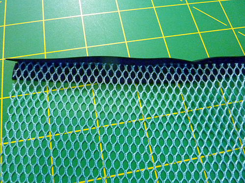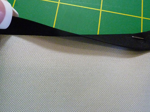 - Slip one length of bias tape over the top raw edge of each mesh panel. Note that one side of the bias tape is ever so slightly longer than the other. This slightly longer side should go against what will be the inside of the mesh pocket. Pin or clip the bias tape in place.