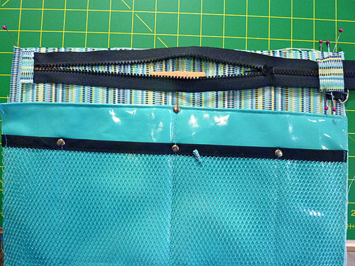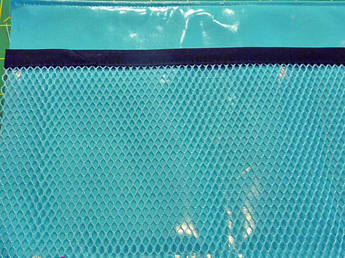 - Place a bound mesh pocket right side up on top of each laminate pocket. The side and bottom edges of the two layers should be flush. Pin or clip along the sides. Then, machine baste along each side of each layered panel, staying close to the raw edges.