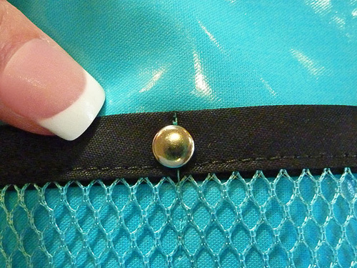 - Each center of the grommet sits approximately 1” in from the side seam and ¾” up from the top bound edge of the mesh pocket. Use the grommet top to mark the placement for the hole.