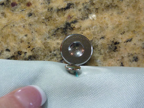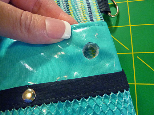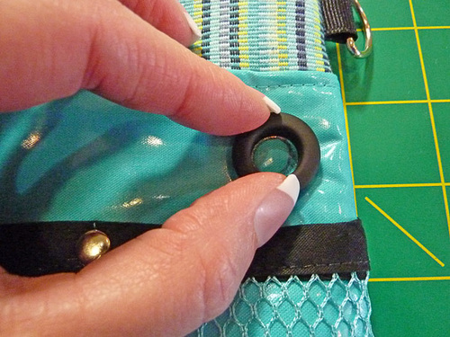 - Insert the grommet top from front to back and then snap the grommet back into position on the inside of the pocket.