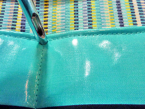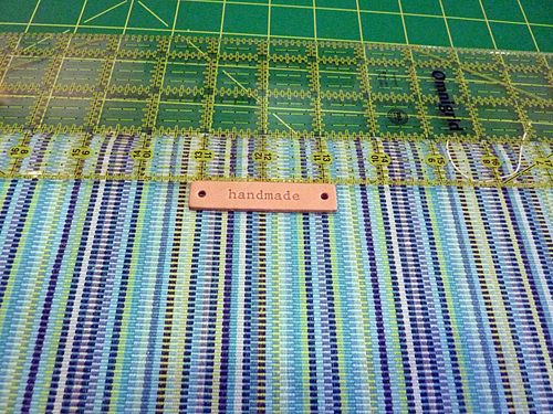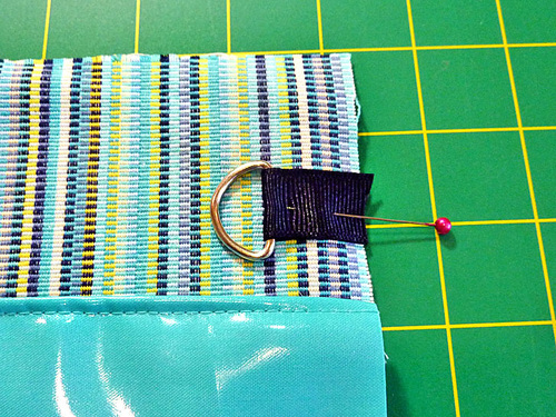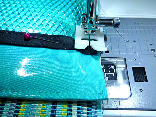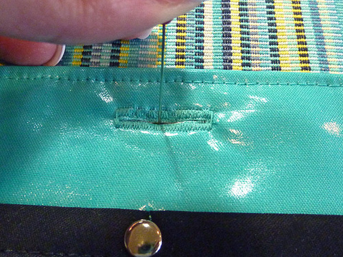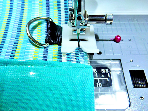 NOTE: Although we often take the time to change our thread color in situations such as this, we didn’t on this project because the little bit of the seam that crosses the binding will be mostly hidden behind the rivet. We used aqua thread throughout.