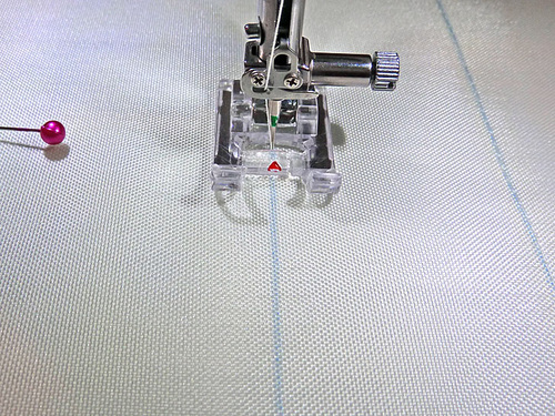 - Stitch along the two outer guide lines only. DO NOT STITCH THE CENTER SEAM YET.