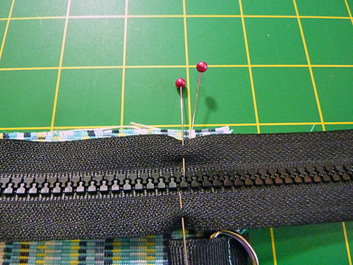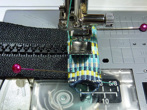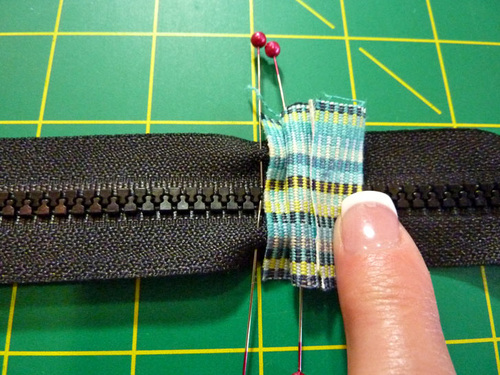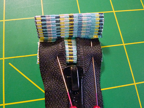 - With the zipper open, but keeping the zipper ends together – ie. side by side. Pin the zipper ends in place on the tab.