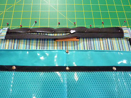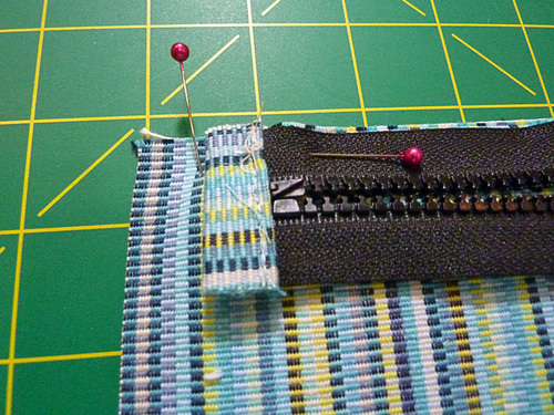 - Re-pin the zipper in place across the top, double checking that the zipper and the panel are right sides together, that each tabbed end sits ½” in from the sides of the panel, and that the zipper pull is situated so, when closed, it’s to the left of the front piece. After checking the position, open the zipper half way.