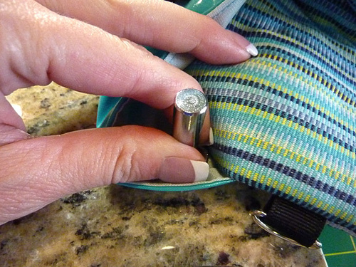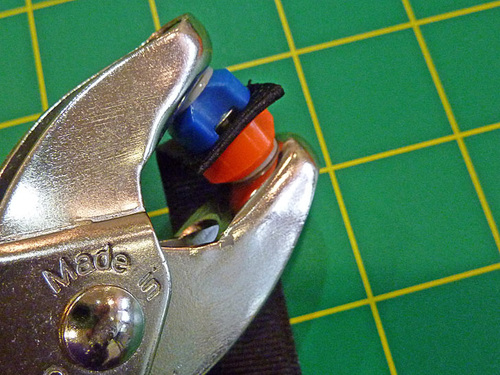- Add a rivet at the top of each seam line (the one on the back and the two on the front… remember, you haven’t yet stitched the middle dividing seam), centering it within the binding. Start by making a hole through all the layers with the Rivet Tools.
