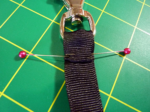 - Slip one end of the ribbon through the Swivel Hook. Tuck under the raw end ¼” and continue pulling through about ½”. Pin in place.
