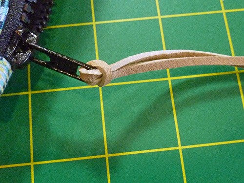 - As a finishing touch, insert the thin leather thong through the zipper pull. To do this, fold the thong in half and push the loop through the open end of the zipper pull, then feed the ends of the thong through the loop and cinch. This is just like how you’d attach a gift or price tag.