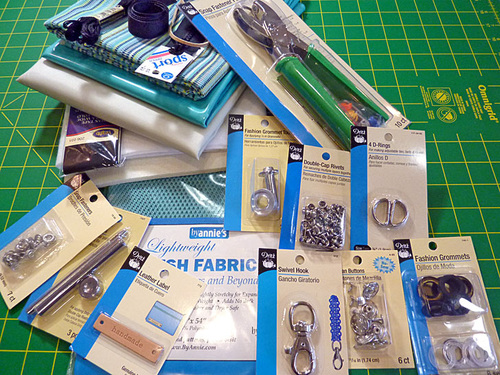 - ¼ yard of 44″+ wide polyester mesh for the lower exterior pocket panels; we found a very handy mesh 18” x 54” pre-cut from ByAnnie, which comes in a variety of cool colors – we used Turquoise