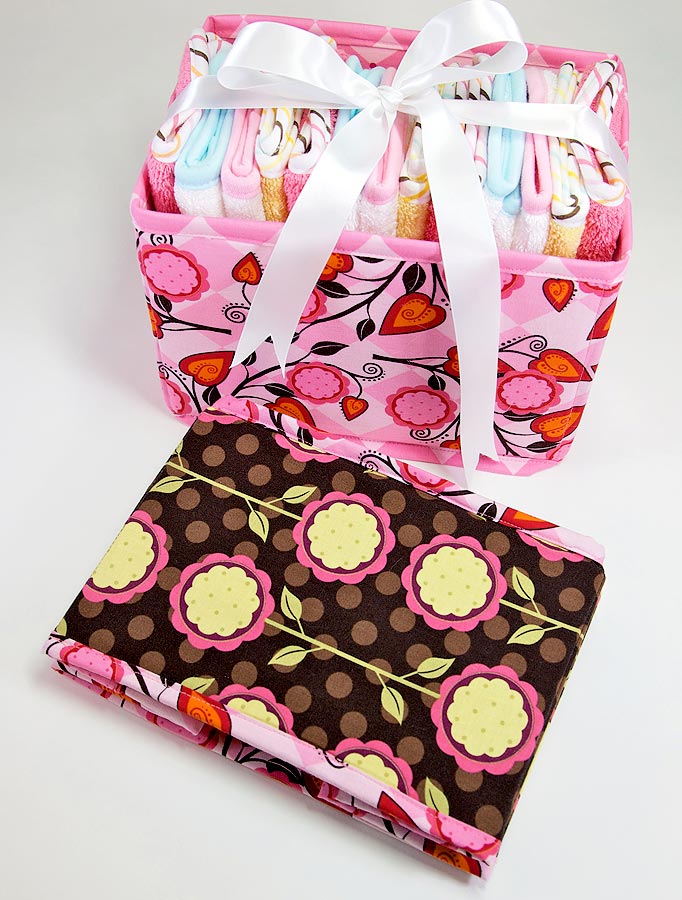The world is full of plastic containers, but the nursery is better served with these lovely fabric containers. They are perfect for washcloths, onesies, socks, booties and so much more. They make a terrific gift filled with diapers or with baby shampoo, lotion, soap, and a comb and brush.