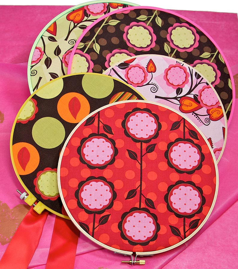 Couldn’t be easier – no sewing involved. All you need are a few inexpensive embroidery hoops and several fabric remnants. This is a great way to accent nursery colors with something eye-catching for baby. Today’s rich fabric prints offer endless possibilities.
