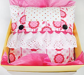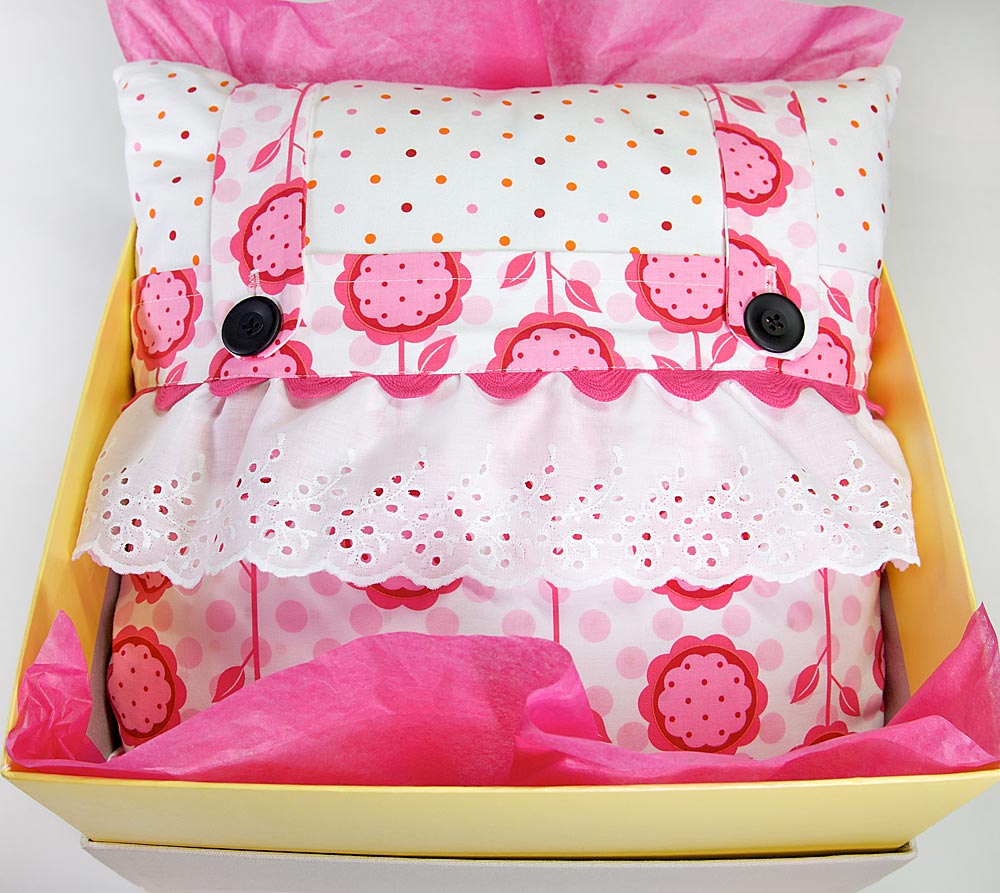 A S4H Pillow Jacket is simply an outfit for a pillow. This pillow is all dressed up in a pretty pinafore perfect for a girl’s room, but you could easily adapt it for a boy. It’s a perfect decor accent on a nursery glider or chair.