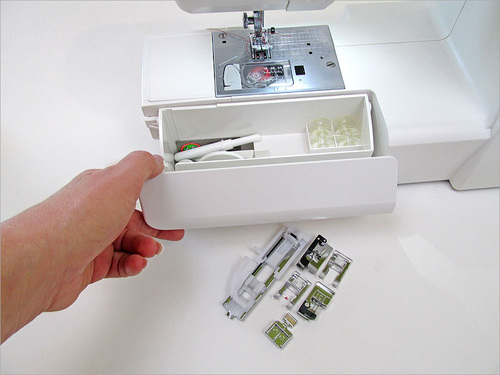 We call them the “go-to features,” the built-in favorites we rely on day-in and day-out. They’re all in the DC2015, including: a top-loading, full rotary hook bobbin; built-in needle threader; locking stitch button; easy bobbin winder; snap-on presser feet; and a start/stop button.