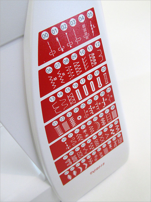 The DC2015 colors are bright Janome red against white, and the accents are applied in a sleek, modern style. We especially like how easy it is to read the white stitch chart against the sharp red background.