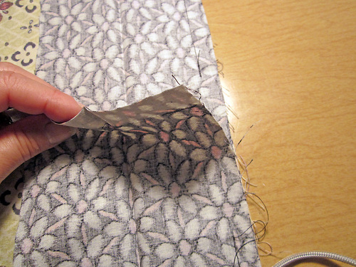 4. Then, lift up the “peak” and snip the side to match. There should be a corner of your main pillow fabric pillow visible between the snips.