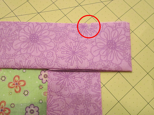 4. Fold this pillow front lengthwise and widthwise to find the center of the top/bottom and both sides. Make a little snip at these four center points within the flange seam allowance. Do not cut into the actual seam