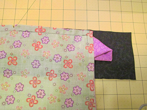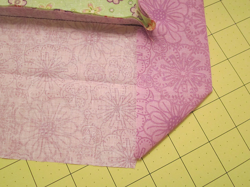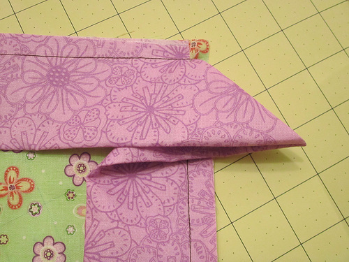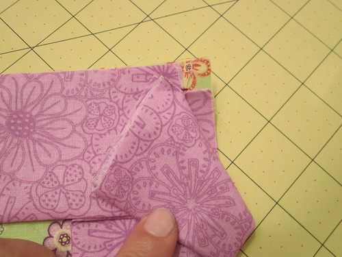 7. Fold in the side, again matching up the raw edge of the flange with the sewn edge/seam allowance of the flange. You will create a pretty folded corner miter on both the front and back of the flange.