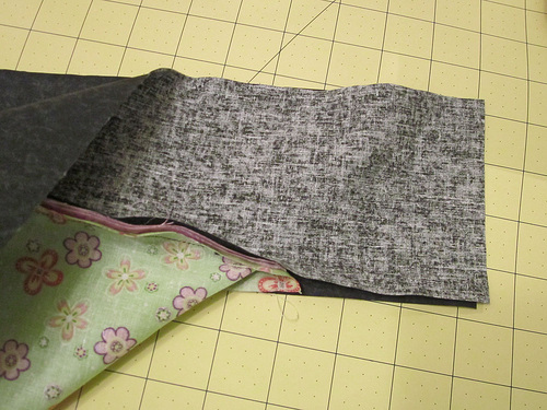 1. Place the sewn panel on your work surface so the main front panel is right side up. Fold the flange in half along its original crease line, wrong sides together.