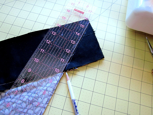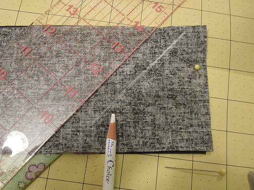 9. Using your see-through ruler and a fabric pen or pencil, draw a line that continues the diagonal angle of the pillow front through the outer flange.