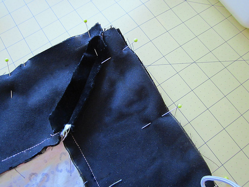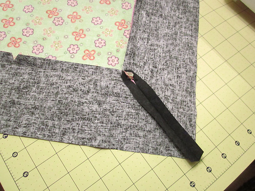 7. Starting at this pin point on the bottom edge of the front panel, place the flange strip right sides together with the front panel, extending the raw end of the flange strip 2″ beyond the pin point. In other words, leave about 2″ free at the head of the flange strip before you begin pinning it to the front panel. The flange strip should be open and flat against the front panel with raw edges aligned.