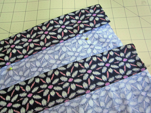 2. Pin one set of three strips right sides together end-to-end to create one long 5” wide strip.
