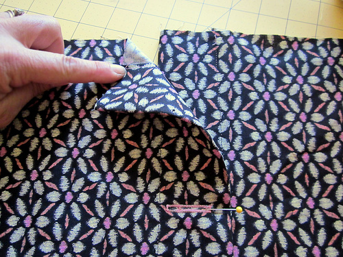 1. Pair up your two finished fronts and back (the back center button should be unbuttoned). Place each front right sides together with a back, matching up all the edges and the indented corners. Pin in place.