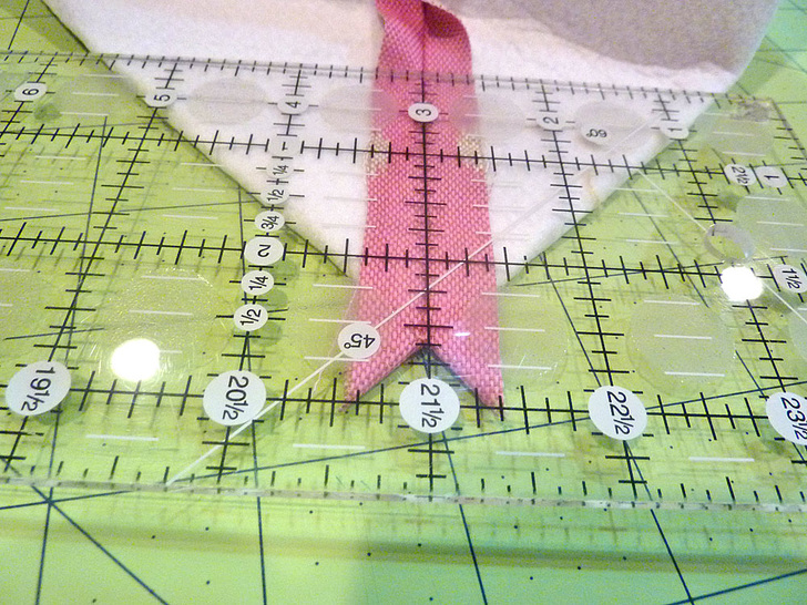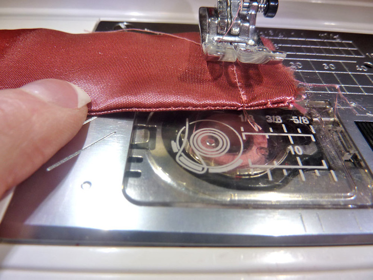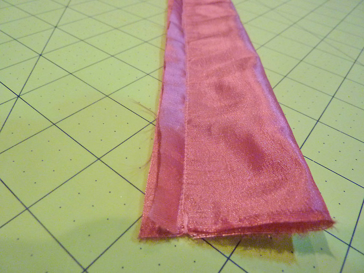 - Find the 4″ x 30″ taffeta strip. Fold it in half lengthwise so it is now 2″ x 30″. Pin in place along the 30″ side.