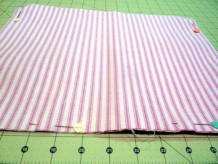 - Place the two interfaced panels right sides together. Pin in place along both sides and across the bottom.