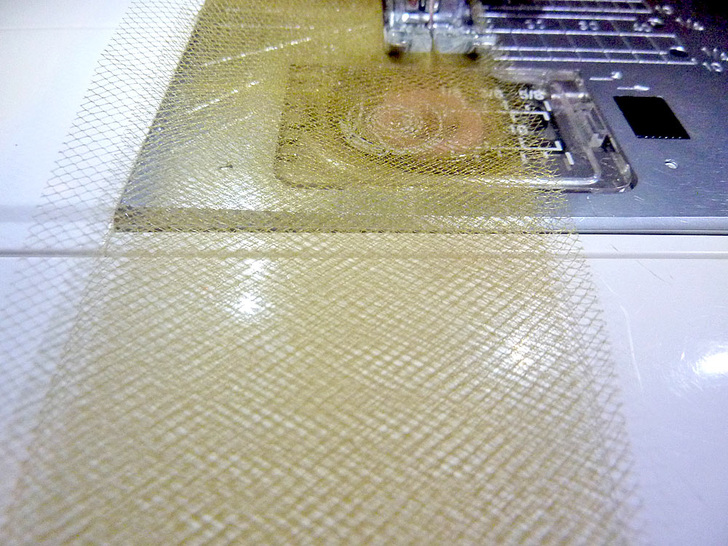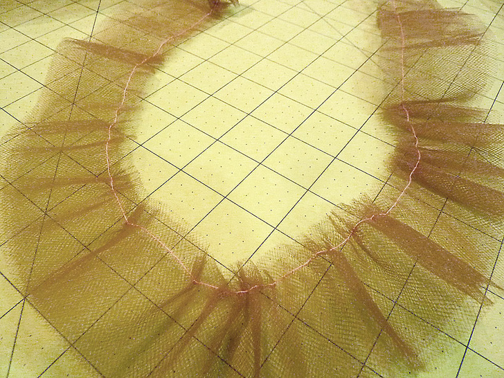 NOTE: The number of tulle layers is variable. For a very wispy look, you could use just a single layer. For a dense ruffle with deeper color, you could use three or even four layers. - Run a gathering stitch along one side through both layers.