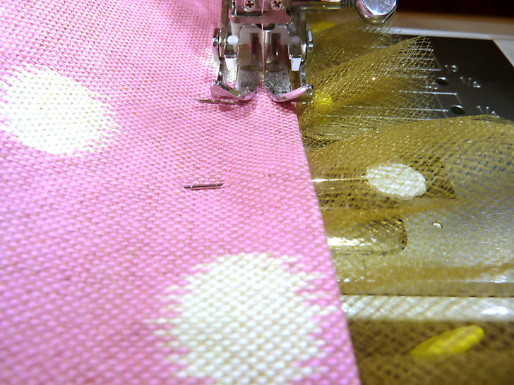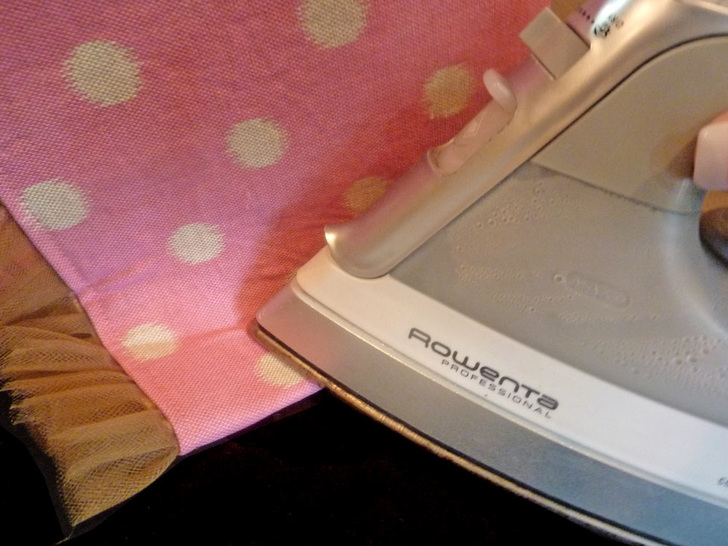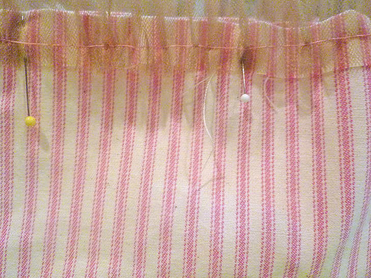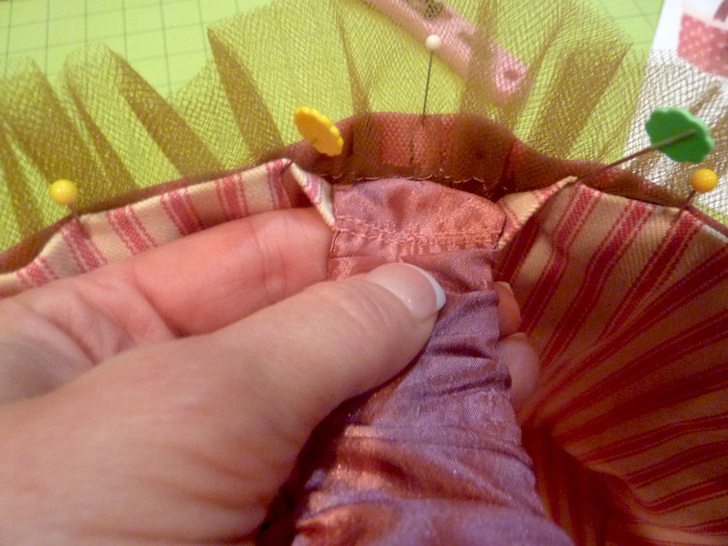 - Pin the bottom gathered edge of the tulle to the wrong side of the top folded edge of the lining. The bottom edge of the tulle should align with the folded-down raw edge of the lining. Pin around the top, adjusting the gathers as needed as you go. Overlap the ends of the tulle just enough to hide them. Pin in place all around.