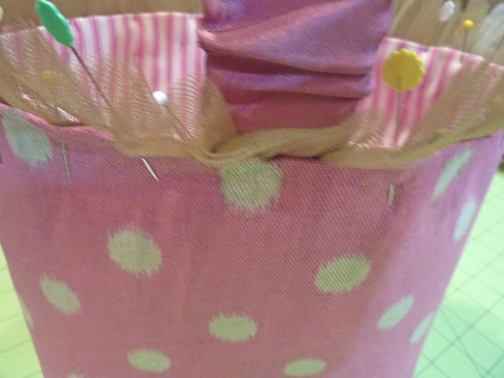 - Find the basket exterior. It should be right side out. Carefully slide the lining (with the tulle securely pinned in place) inside the exterior so the two layers are now wrong sides together. Match up the side seams and the boxed bottoms of the two pieces.