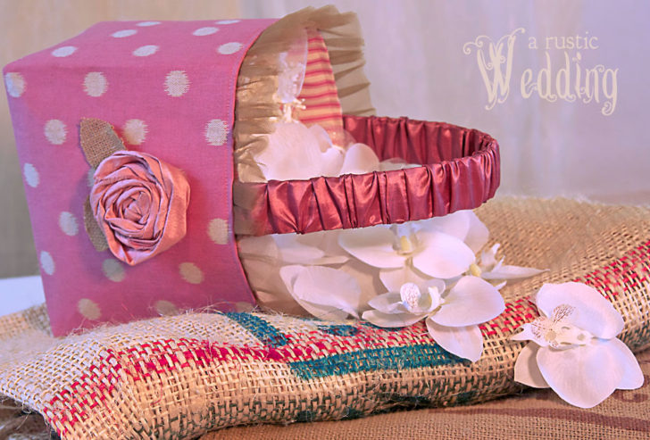 The finished basket is approximately 8″ wide x 7″ tall (excluding the 1″ high tulle ruffle) and 5″ deep, which is also a perfect size and depth for other uses at the wedding: passing out packages of groom’s cake, holding bundles of birdseed for the after-wedding send off, carrying wedding programs, or keeping flatware and linens on the banquet tables. Without the handle, it would be a gorgeous base for guest table centerpieces.