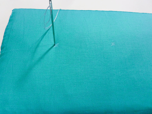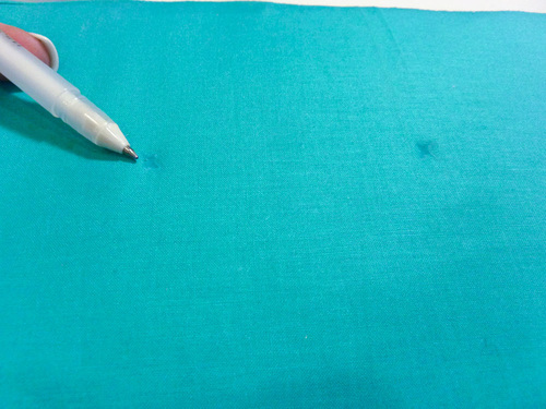 - You want your mark to be a small “X” shape. The mark should be easily visible, but you are working on the right side of your fabric and the marks may not be completely covered by the stitching. Make sure you select a fabric pen or pencil that will easily wipe away or will vanish with exposure to the air.