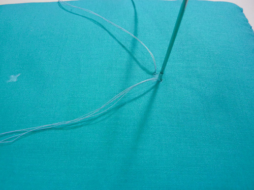- Insert the needle into the marked point from the back side of the cushion. You are starting at one of the top points of the drawn “X”. Leave a tail of about 5” in length.