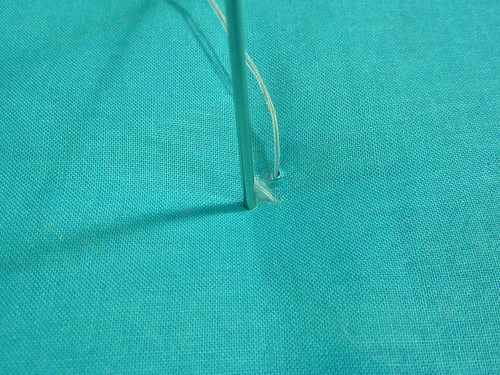 - Take a small stitch (about ⅛”) at the back and push the needle in again, back to front. The image below shows the needle being inserting back in.
