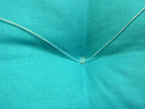 - Insert the needle back into the cushion at the opposite end of that tiny diagonal line of the “X” and push it through to the back.