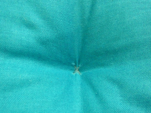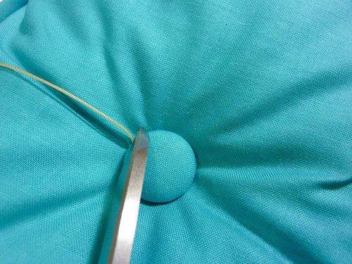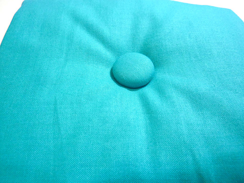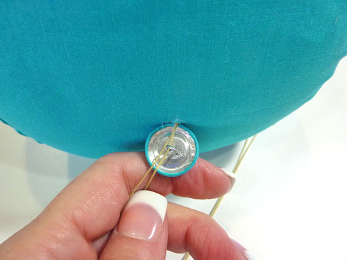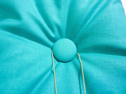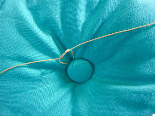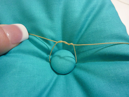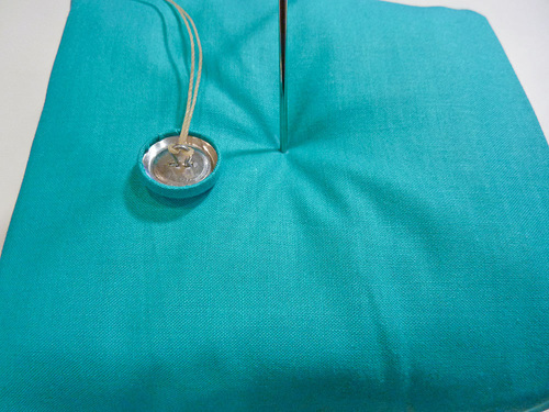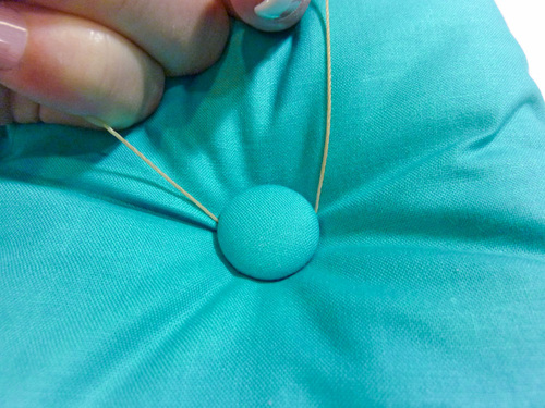 - Pull the thread all the way through, coming at the marked point at the opposite side of the cushion. Keep pulling until the first covered button sits flat against the cushion.