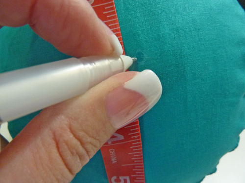 - Mark the position for each of your buttons. For our sample, we selected just one center point in our tiny cube. Remember to mark the point(s) on both the top and bottom of the cushion.