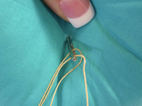 - Pass the the cut ends of the thread through the looped end.