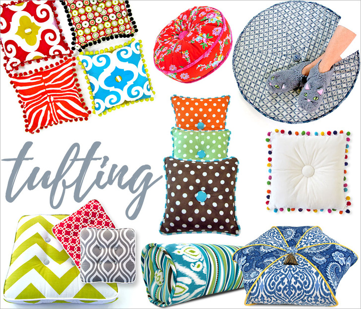 Sew4Home projects. Top row, left to right: Happy Pom Pom Pillows, Round Piped Pillow with Gathered Top, Big Round Floor Cushion with Fussy Cut Wedges; middle row: Decorative Stitch Pillow Power, Tufted Multi-Color Pom Pillow; bottom row: Bundle of Box Style Floor Cushions, Outdoor Living Bolster, Hexagon Pillow with Wraparound Cording.