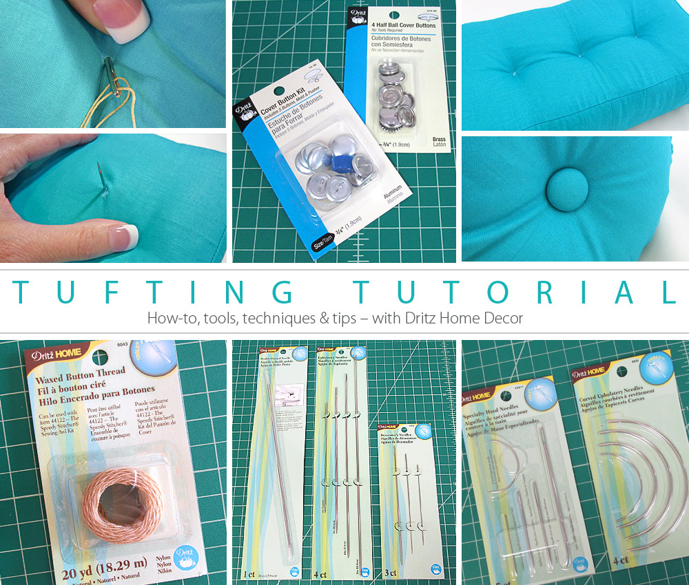 The definition of tufting is pretty simple: make depressions at regular intervals in a cushion by passing a thread through and pulling it taut. And really, it is that simple. If (and there is always an “if” isn’t there?) you have the right tools and make sure you measure and mark with precision. Thanks to the creative minds at Dritz®, you can easily get all the tools you need to make things easy. We show you the techniques to use those tools to do stitch tufting and button tufting on a standard cushion width, as well as how to tackle bolster tufting with those extra long needles… they’re not as scary as they might look!