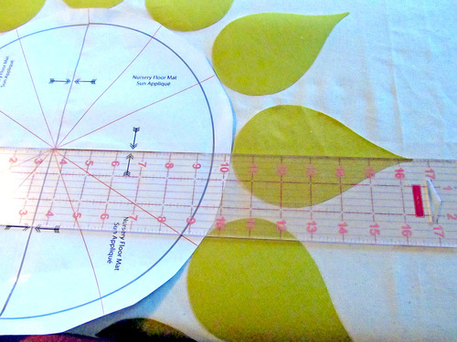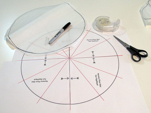- Cut out the Sun Appliqué With Guidelines from the original paper print out. Make SURE you cut around the circle along the outside points of the twelve red guide lines that extend beyond the circle itself. This is very important because we have precisely measured and drawn these guide lines to allow you to match up the extended red line with the base of each teardrop to insure the rays are perfectly spaced all around the center circle. Clever huh? Why yes it is; but it only works if you very carefully cut out the circle.