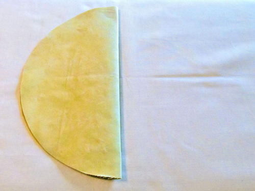 - Peel away the paper from the center circle appliqué. Very carefully (because now the back is a little sticky) fold this circle in half, right sides together. Align the center vertical fold of the circle along the vertical crease line of the base panel.