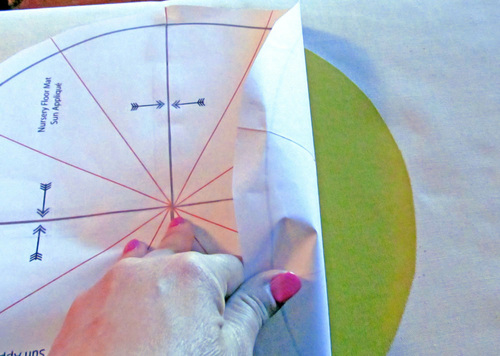 - Gently fold the appliqué circle along the horizontal and adjust as needed top to bottom to insure the center of sun precisely aligns with the intersecting center lines of the base panel.