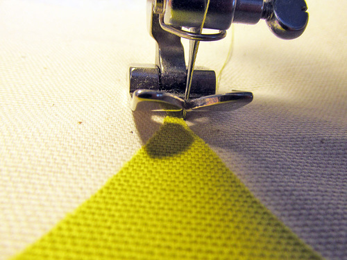 - Your needle should run right along the edge of the appliqué shape. Go slowly, and remember to stop, with the needle in the down position, if you need to pivot or readjust. You are stitching through the fabrics and the batting, so you should not need any additional stabilizer.