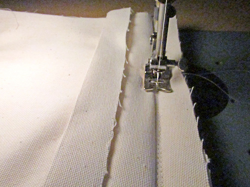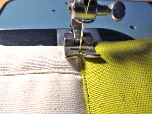- Switch to a Zipper foot. Stitch the binding ends together, running your seam right along, BUT NOT ON, the bound rug layers.