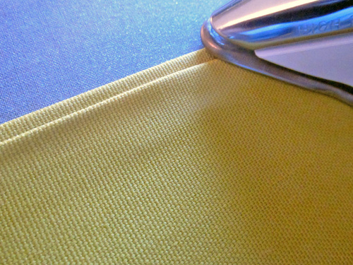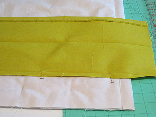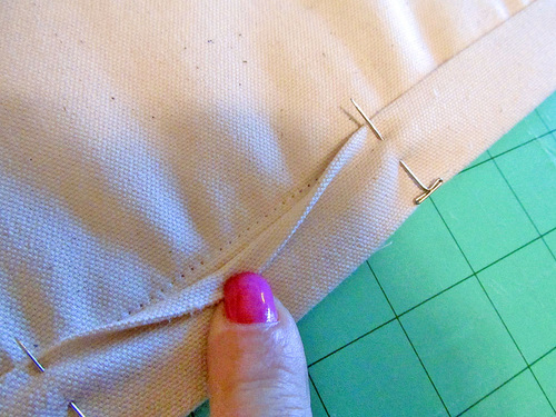 - Wrap the binding to the front, encasing the raw edge. The binding should cover the original seam by about ⅛”. Pin in place.