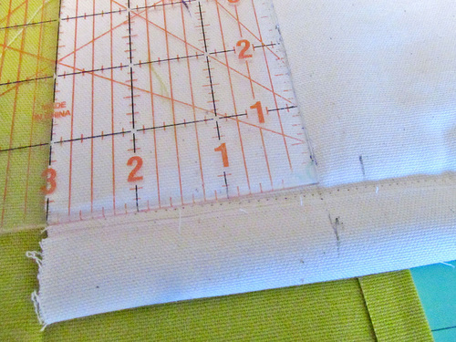 - Use a clear ruler to measure 3″ in from one raw side edge. Using a fabric pen or pencil, draw a vertical line at this measurement.