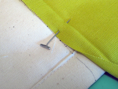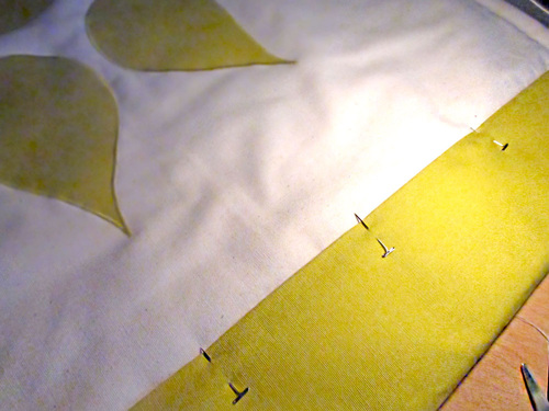 - Place the top panel, with all the appliqué shapes fused in place, on top of the batting. Center the fabric panel on the batting. There will be about 1″ of batting extending beyond the fabric all around. Pin the layers together. We used T-pins. Be generous with your pinning, you want to minimize shifting.