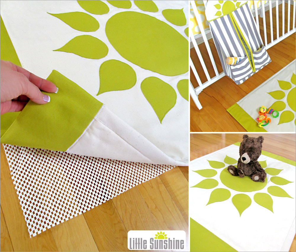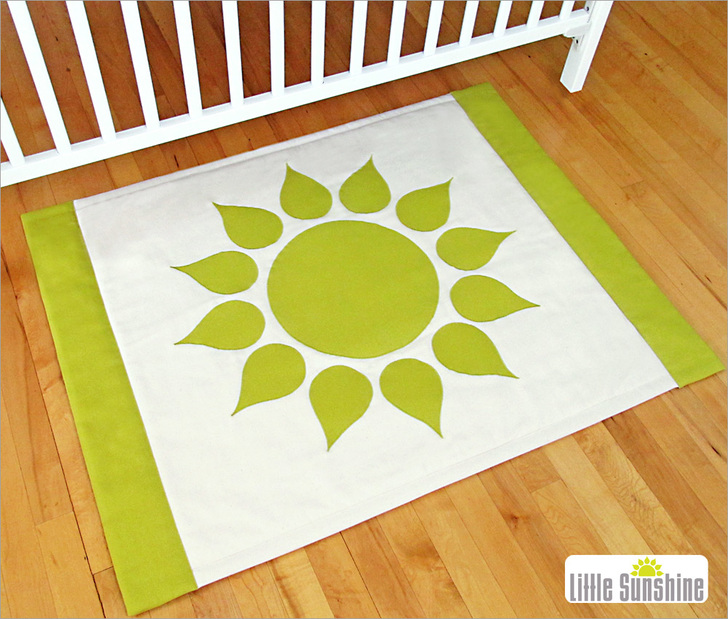 The majority of nurseries we reviewed for our original Little Sunshine series opted for wall-to-wall carpeting to keep things soft and help muffle sounds, such as mom and dad trying to sneak out of the room and back to bed. Whether you have hardwood or carpet, an accent rug adds a great splash of color and helps protect the floor in the high-traffic, spill-zone directly in front of the crib. We feature the same pretty sunshine appliqué as is featured on our Little Sunshine Hanging Diaper Stacker, but in a jumbo size.