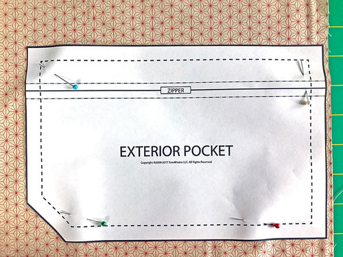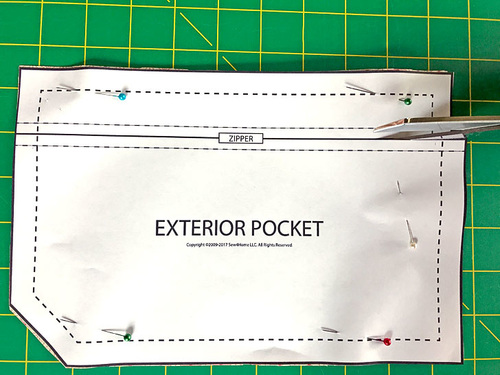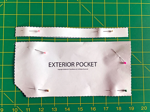Using the two Exterior Pocket pattern pieces, cut ONE piece of interfacing for the top and one for the bottom, cutting along the dotted seam allowance line.